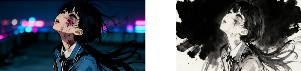 本作では、日本的美意識を強めるために水墨画スタイルへの変換を行っています。