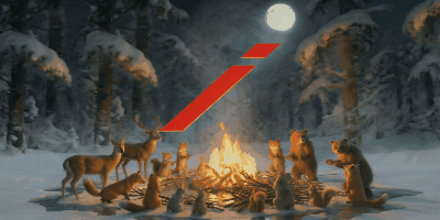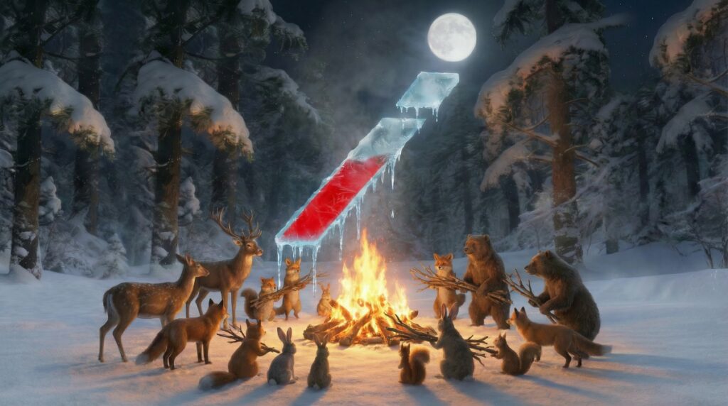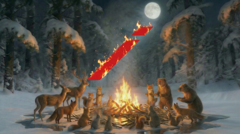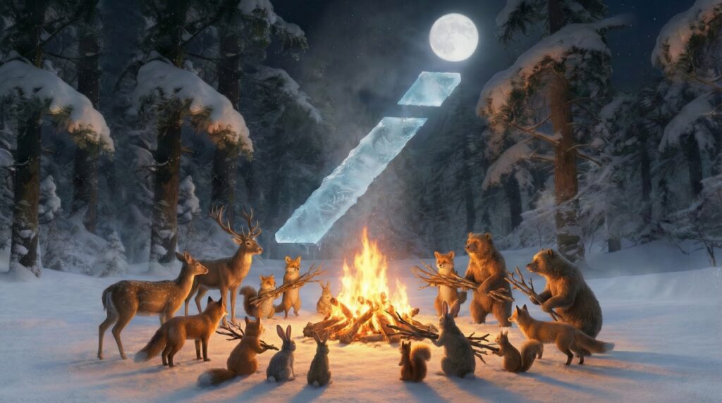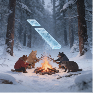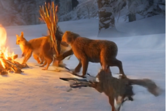 - 動物が木を持ちよって暖を取る
