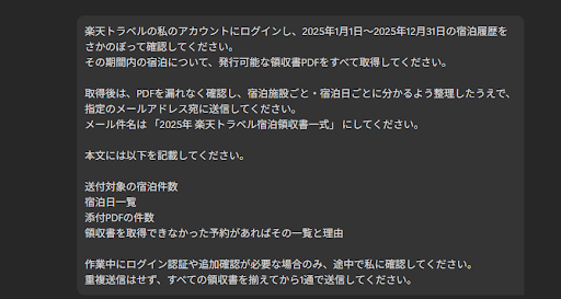 領収書はPDFでまとめて、指定アドレスに送ってほしい。」
